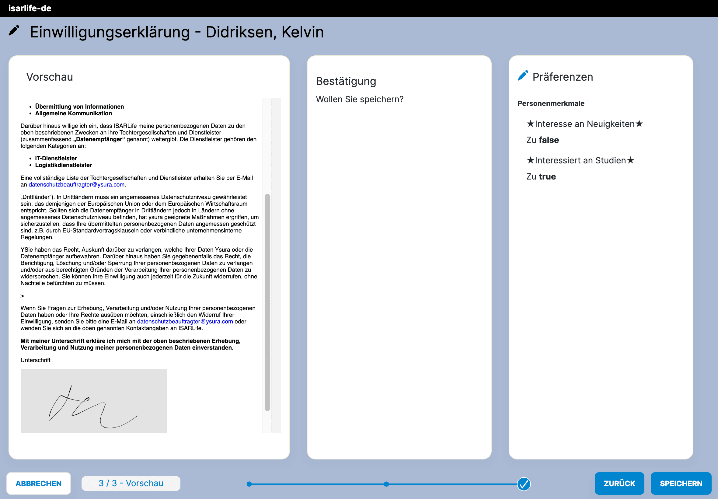Einwilligungsvorlagen können verwaltet und individuell angepasst werden. Die Double-Opt-In-Funktion kann per E-Mail oder SMS genutzt werden und wird durch eine Erinnerungsfunktion ergänzt. Zudem können Präferenzen als Merkmale abgefragt und dokumentiert werden.