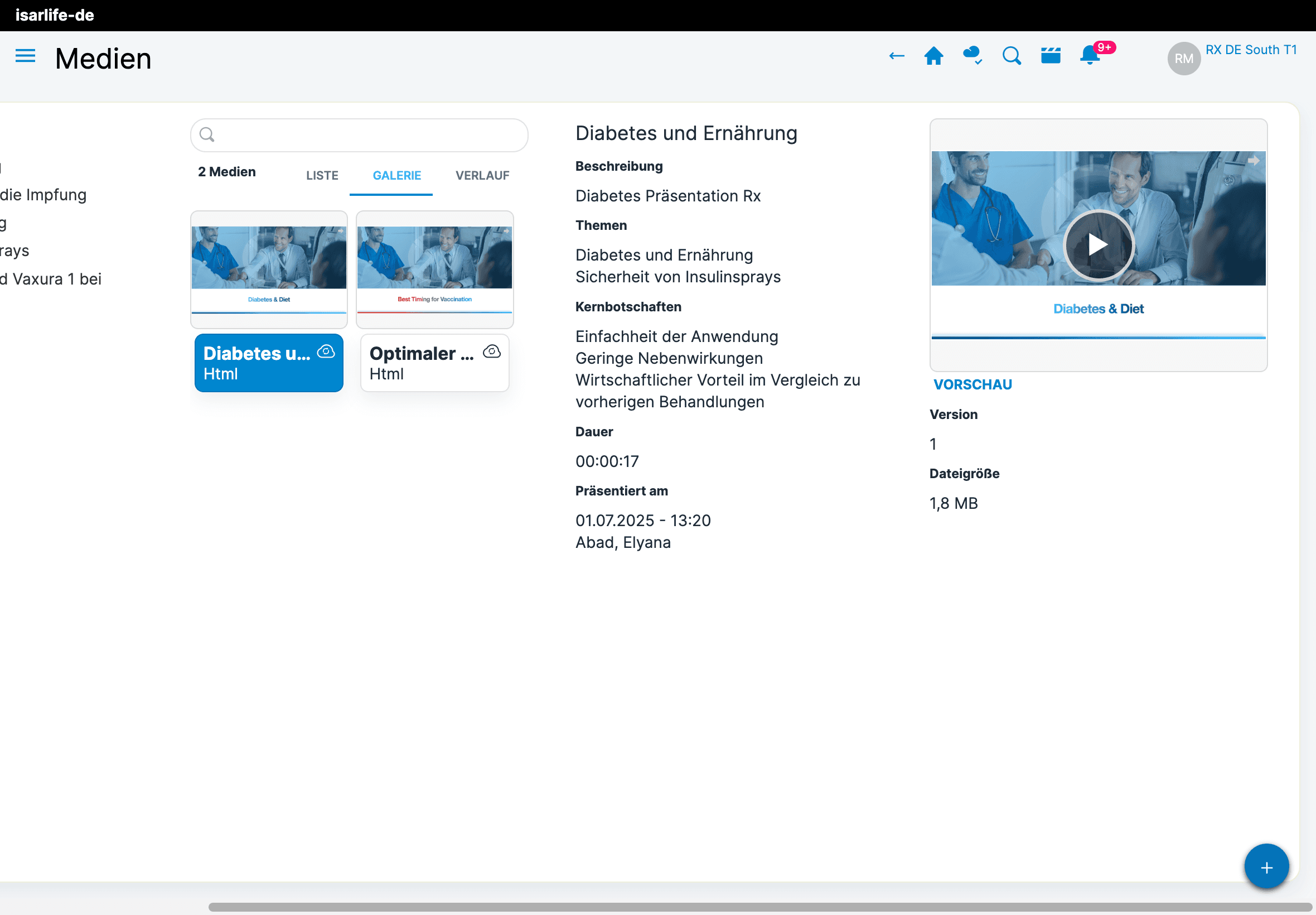 Das Modul eDetailing bietet eine umfassende Lösung zur Verwaltung und Präsentation freigegebener Medien für gezielte Kundeninteraktionen. Medien können Themen und bestimmte Kernbotschaften zugeordnet und Gültigkeit sowie Sichtbarkeit definiert werden. Die Medienauswahl kann spezifisch auf Aktivitäten und Produkte abgestimmt werden, unterstützt durch ein detailliertes Berechtigungsmanagement. Zusätzlich können Feedback und Kernbotschaften dokumentiert werden, um eine kontinuierliche Optimierung der Kommunikation sicherzustellen. Das Modul ermöglicht eine Auswertungen der Mediennutzung, erfasst Interaktionen wie Seitenaufrufe und visualisiert die Kernbotschaften-Journey mit zugehörigen Reaktionen.
