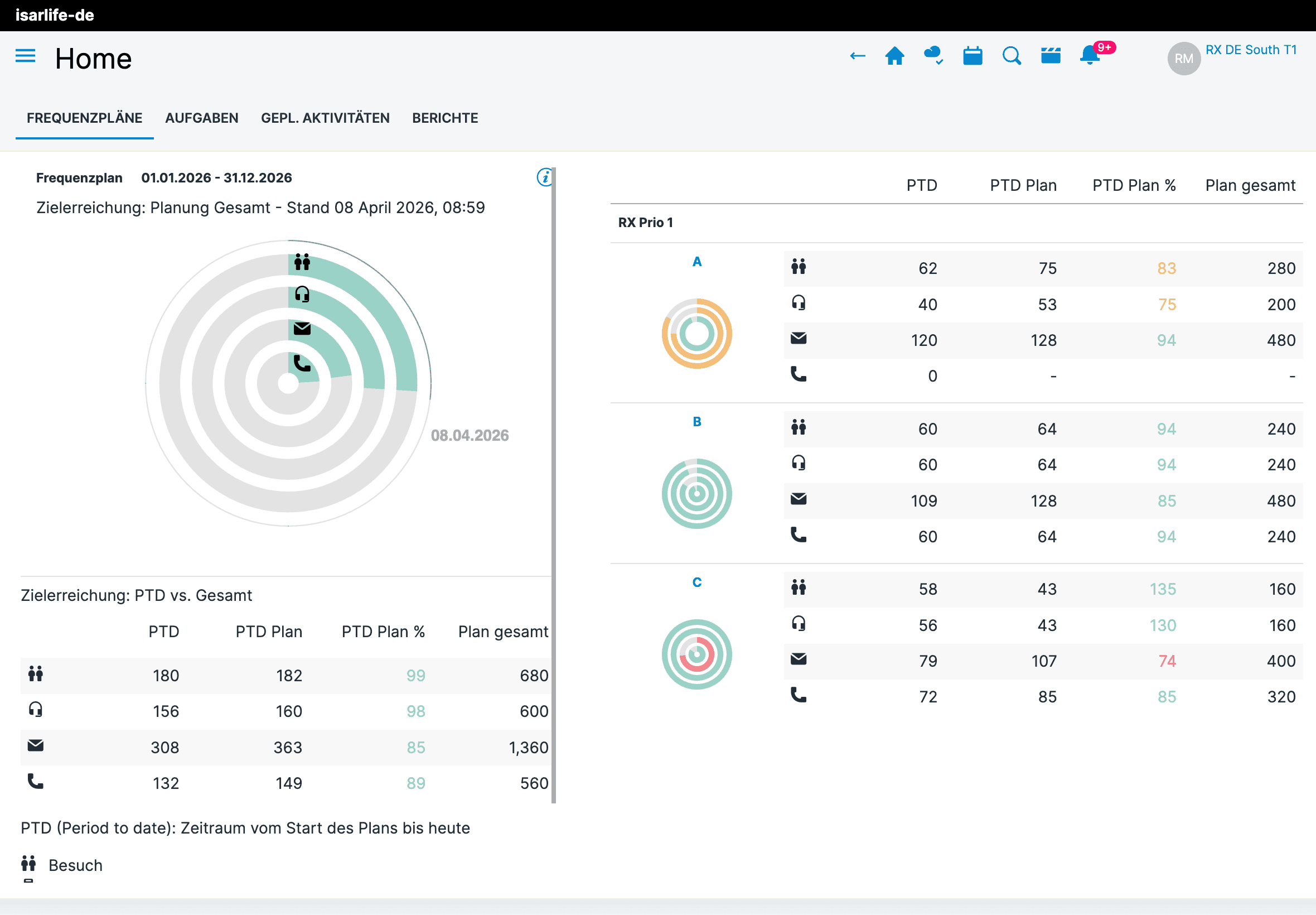 Das Modul bietet eine umfassende Auswertung und Übersicht über alle Zielkunden, einschließlich Soll-/Ist-Vergleichen und detaillierter Diagramme. Mit einer aggregierten Manager-Ansicht und Übersichtsdiagrammen auf der Startseite bleibt die Frequenzplanung jederzeit transparent und leicht steuerbar.
