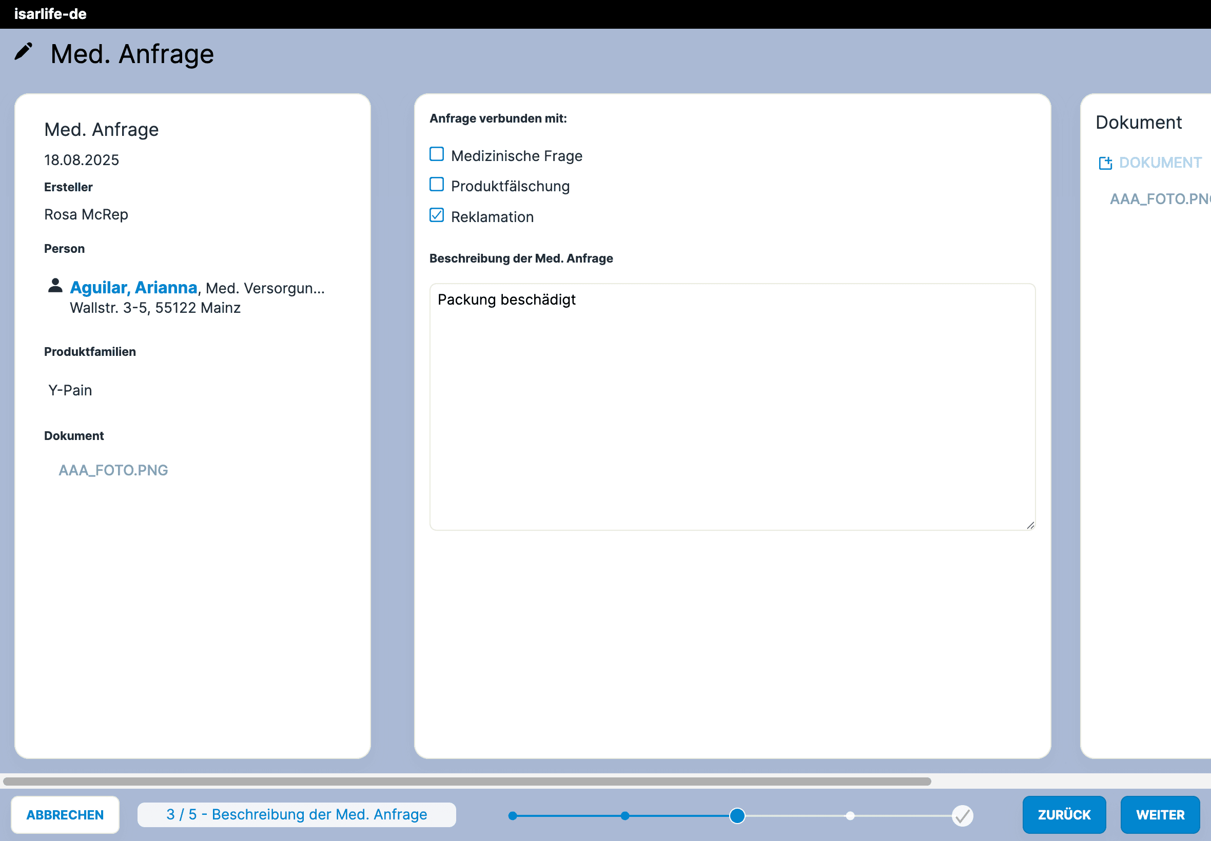 Das Modul Medizinische Anfragen ermöglicht die strukturierte Erfassung von medizinischen Anfragen. Nutzer können Themen und Produktfamilien auswählen, sowie Dokumente hinzufügen, um Anfragen präzise zuzuordnen. Das Modul ist sowohl für den Außendienst als auch für Qualitätssicherung und Pharmakovigilanz geeignet und gewährleistet eine klare Trennung der Verantwortlichkeiten durch die steuerbare Sichtbarkeit von Anfragen. Zusätzlich können bei neuen Anfragen Benachrichtigungen an definierte Benutzergruppen gesendet werden, um eine schnelle und gezielte Bearbeitung sicherzustellen.