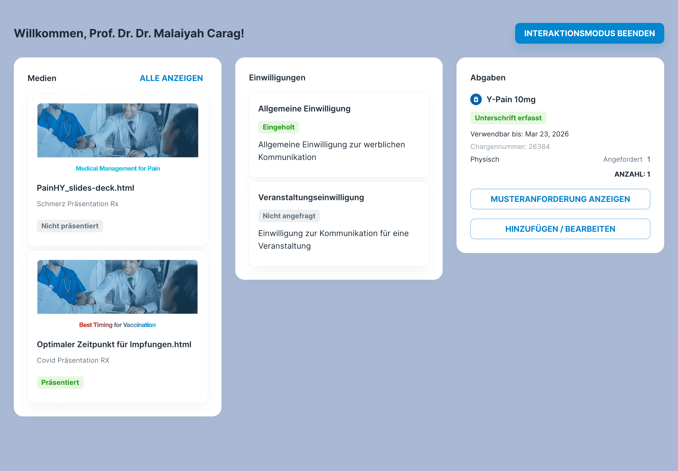 Das Modul Persönliche Interaktion bietet ein intuitives Dashboard, das während der Kundeninteraktion Zugriff auf alle relevanten Informationen und Funktionen ermöglicht. Es unterstützt die Präsentation von eDetailings, das Verwalten und Einholen von Einwilligungen sowie die Erstellung digitaler Musteranfragen. Um die Interaktion nahtlos und effizient durchzuführen, werden alle Informationen im Hintergrund in einer Aktivität gespeichert.