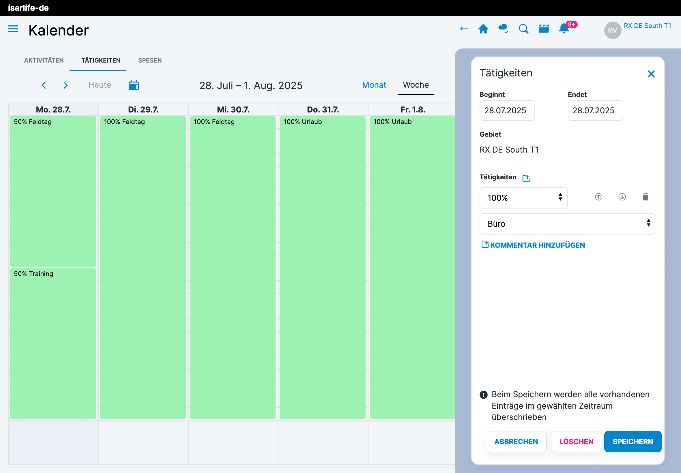 Das Modul Tätigkeiten ermöglicht die Dokumentation von unterschiedlichen Tätigkeitsarten mit flexiblen Konfigurationsmöglichkeiten. Arbeitstage können prozentual in 25 %, 50 % oder 100 % unterteilt werden, um eine präzise Verteilung der Arbeitszeit zu gewährleisten. Es unterstützt frei konfigurierbare Tätigkeitsarten, die individuell an die Anforderungen des Unternehmens angepasst werden können. Zusätzlich berücksichtigt das Modul Zuweisungen, um Tätigkeiten gezielt mit bestimmten Regionen oder Bereichen zu verknüpfen.