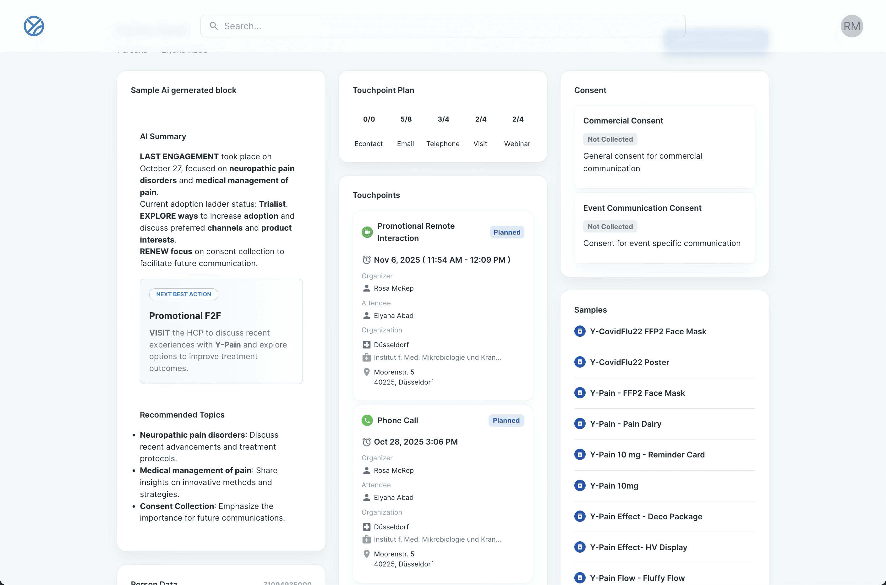 Empower your sales representatives to create personalized customer journeys using our CRM. By leveraging its intuitive interface, your team can tailor each interaction to the unique preferences of HCPs. From remote calls to face-to-face meetings and personalized emails, our CRM helps your team foster engaging connections.
