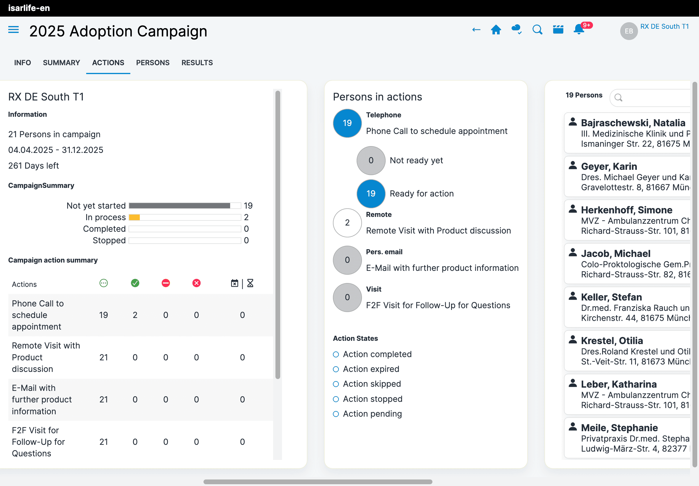 Automated task creation and linking of media and email templates to specific campaign steps ensure efficiency and consistency. The campaign widget displays relevant information directly at the individual level, while campaign progress can be tracked across all organizational levels (marketing, sales, management). Detailed reporting allows you to analyze results during and after the campaign for ongoing optimization.