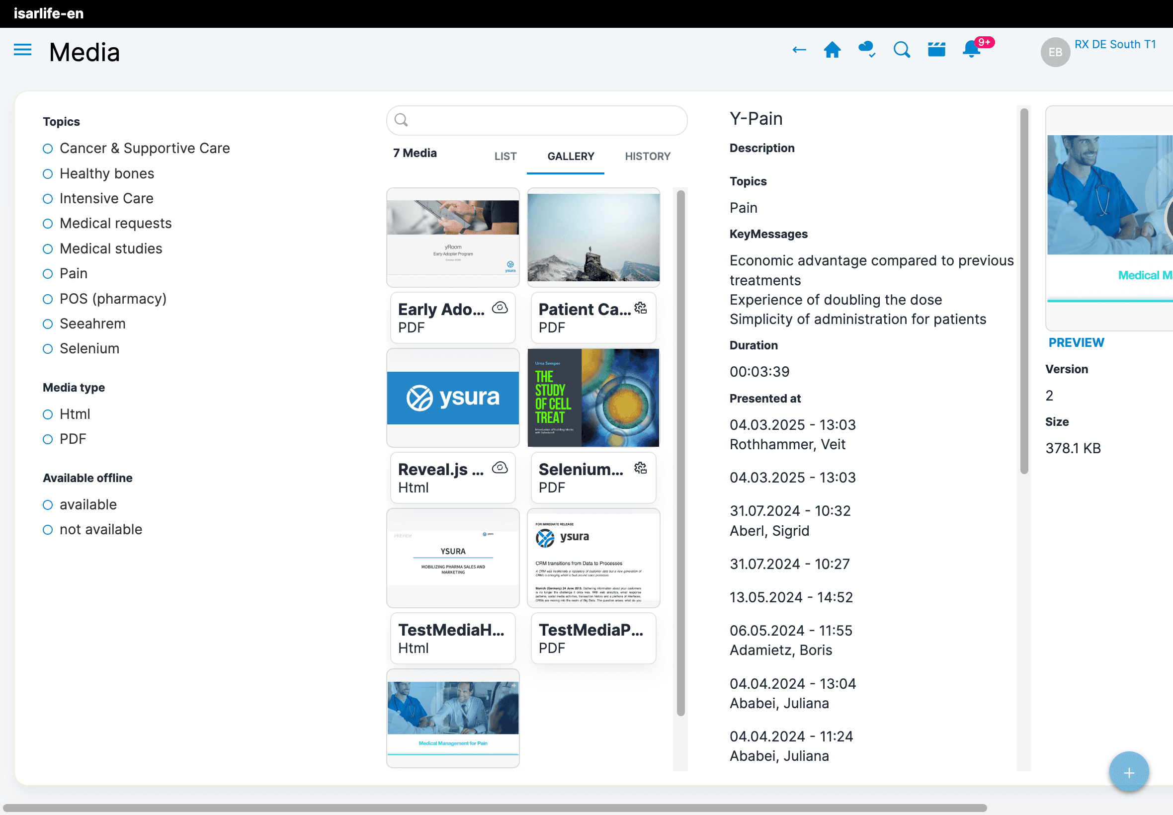 The eDetailing module provides a comprehensive solution for managing and presenting approved media for targeted customer interactions. Media can be associated with topics and specific key messages, and validity and visibility can be defined. Media selection can be tailored to specific activities and products, supported by detailed permission management. In addition, feedback and key messages can be documented to ensure ongoing communication optimization. The module enables evaluation of media usage, tracks interactions such as page views, and visualizes the key message journey with associated responses.