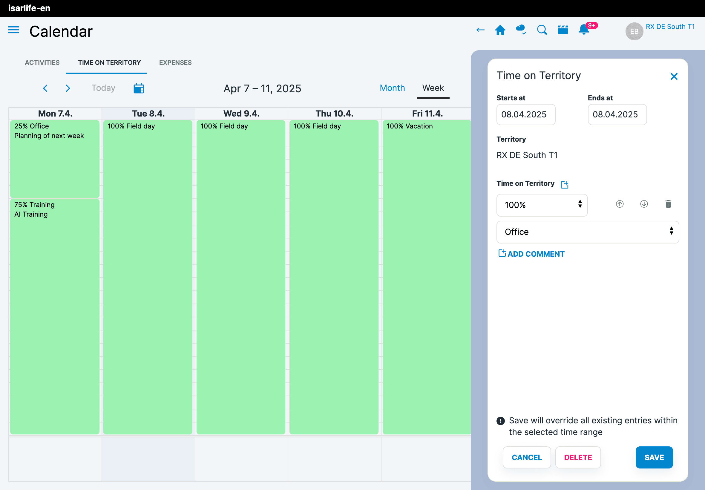 The Time on Territory module allows the documentation of different types of activities with flexible configuration options. Working days can be divided into percentages of 25%, 50% or 100% to ensure a precise distribution of working time. It supports freely configurable activity types that can be customized to meet the needs of the organization. In addition, the module takes into account assignments to link activities to specific regions or areas.